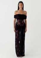 The Hannah | Lace Gown Maxi is designed with a body-skimming silhouette that combines softness and structure. Featuring an off-shoulder neckline and sheer lace panel detailing, this gown offers subtle contrast while maintaining a refined, elegant appearance. The draped waist enhances natural shape, while the floor-length skirt creates a clean, elongated line.