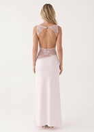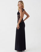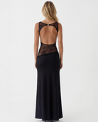 The Madeline | Veil Cut Maxi is designed with clean lines and subtle detailing for a refined, modern look. Featuring a sheer lace waist panel and an open-back silhouette, this dress creates a balanced contrast between structure and softness. The sleeveless, high-neck design keeps the front minimal, while the floor-length skirt adds fluid movement and an elongated appearance.