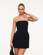The Alina | Strapless Tailored Mini Dress is designed as a refined essential for modern evenings. Featuring a clean strapless neckline and subtle waist contouring, this dress offers a structured silhouette with a smooth, sculpted appearance. Refined flap detailing adds a minimal architectural accent without disrupting the streamlined design.